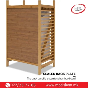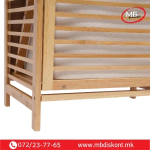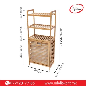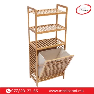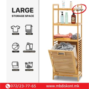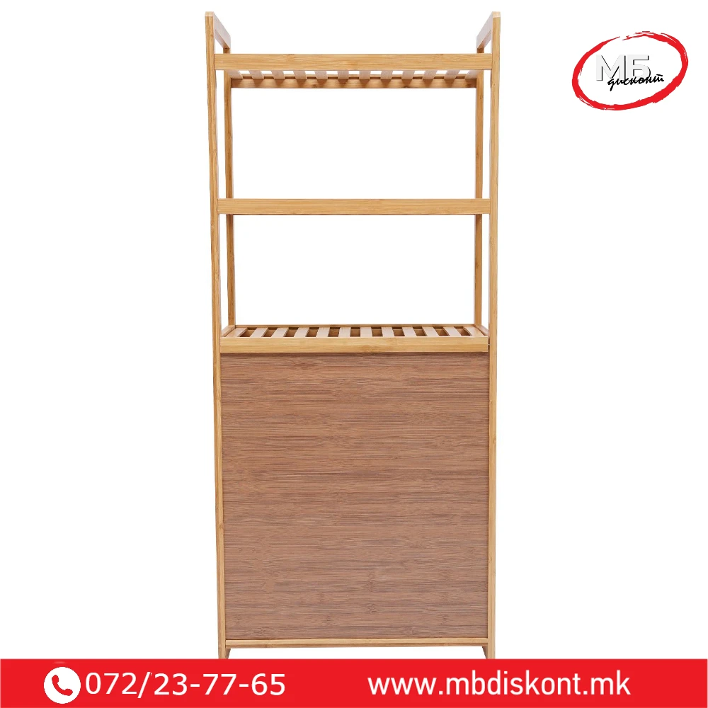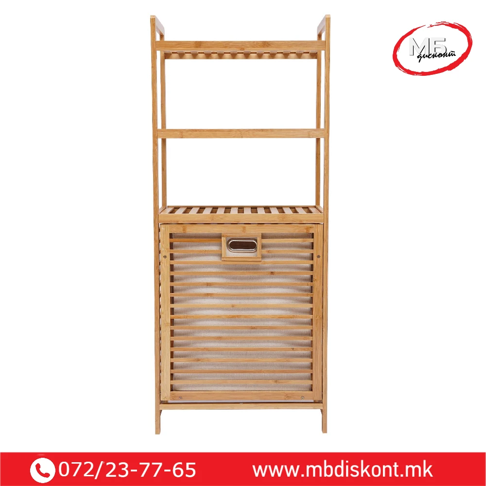 Корпата располага со три нивоа за складирање. Горните полици се идеални за пешкири, козметика или додатоци. Долниот дел служи за складирање валкана облека. Пространиот дизајн собира цело перење пред празнење. Капакот се отвора лесно и овозможува брз пристап. Конструкцијата е стабилна и издржлива. Благодарение на природниот бамбус, производот изгледа топло и модерно. Може да се користи и за складирање растенија, крпи или други домашни предмети.