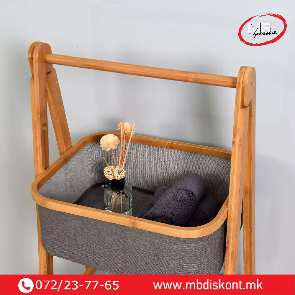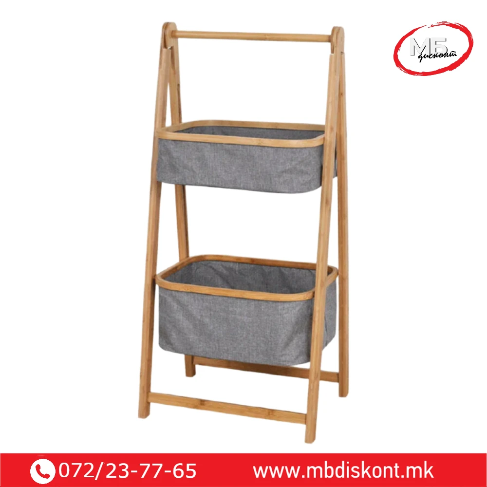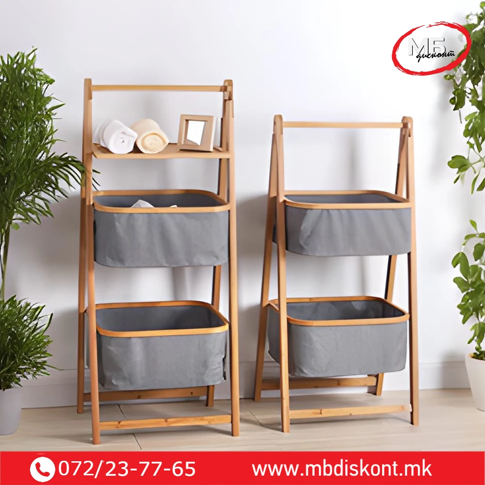 | 🧺 2 фиоки + полица | 45 × 33 × 99 cm | Бамбус / полиестер / памук | 2 отстранливи фиоки, горна полица, склоплива конструкција |