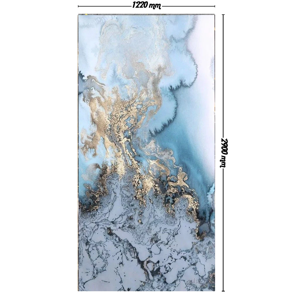 ПВЦ мермерни панели Cloud Dream претставуваат вистинско уметничко дело кое го носи духот на современата апстрактна уметност во вашиот дом. Овој уникатен дизајн се одликува со нежни небесно сини тонови кои се преливаат со бели и светло сиви нијанси, додека низ целата површина се протегаат шиканозни златни и шампањ акценти кои потсетуваат на облаци на зајдисонце. Ефектот е како да гледате во небото од авион – мирно, воздушно и бескрајно инспиративно.