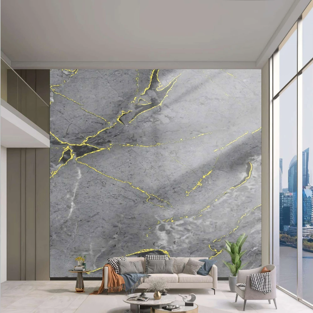 Димензиите од 1220mm ширина и 2900mm висина овозможуваат ефикасно покривање на целосни површини со минимални споеви, што го зголемува визуелниот континуитет. Комбинацијата на неутрална сива основа со живи златни детали создава совршен баланс помеѓу суптилност и луксуз. Материјалот е водоотпорен и лесен за одржување, што го прави идеален избор за простори каде што се бара софистицираност без компромис со функционалноста.