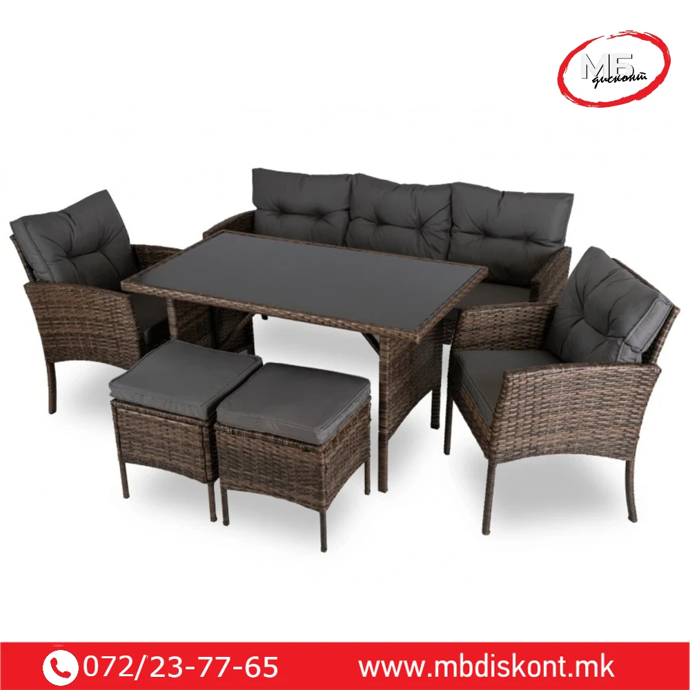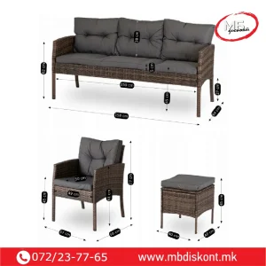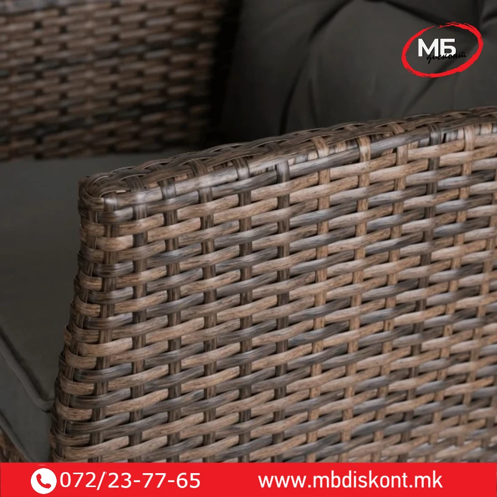 Мебелот е обложен со техноратан во нееднаква кафеава нијанса,