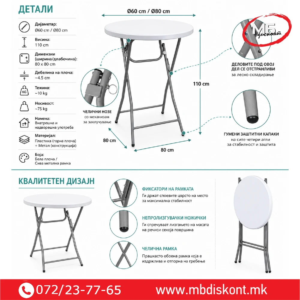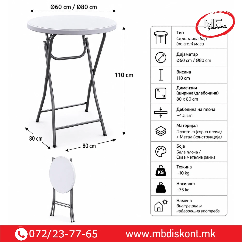 🍸 Коктел маса склоплива Ø60 / Ø80 cm – метална конструкција