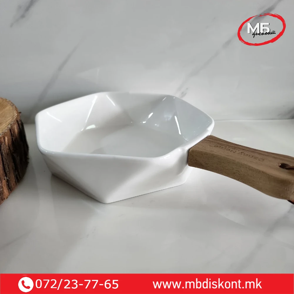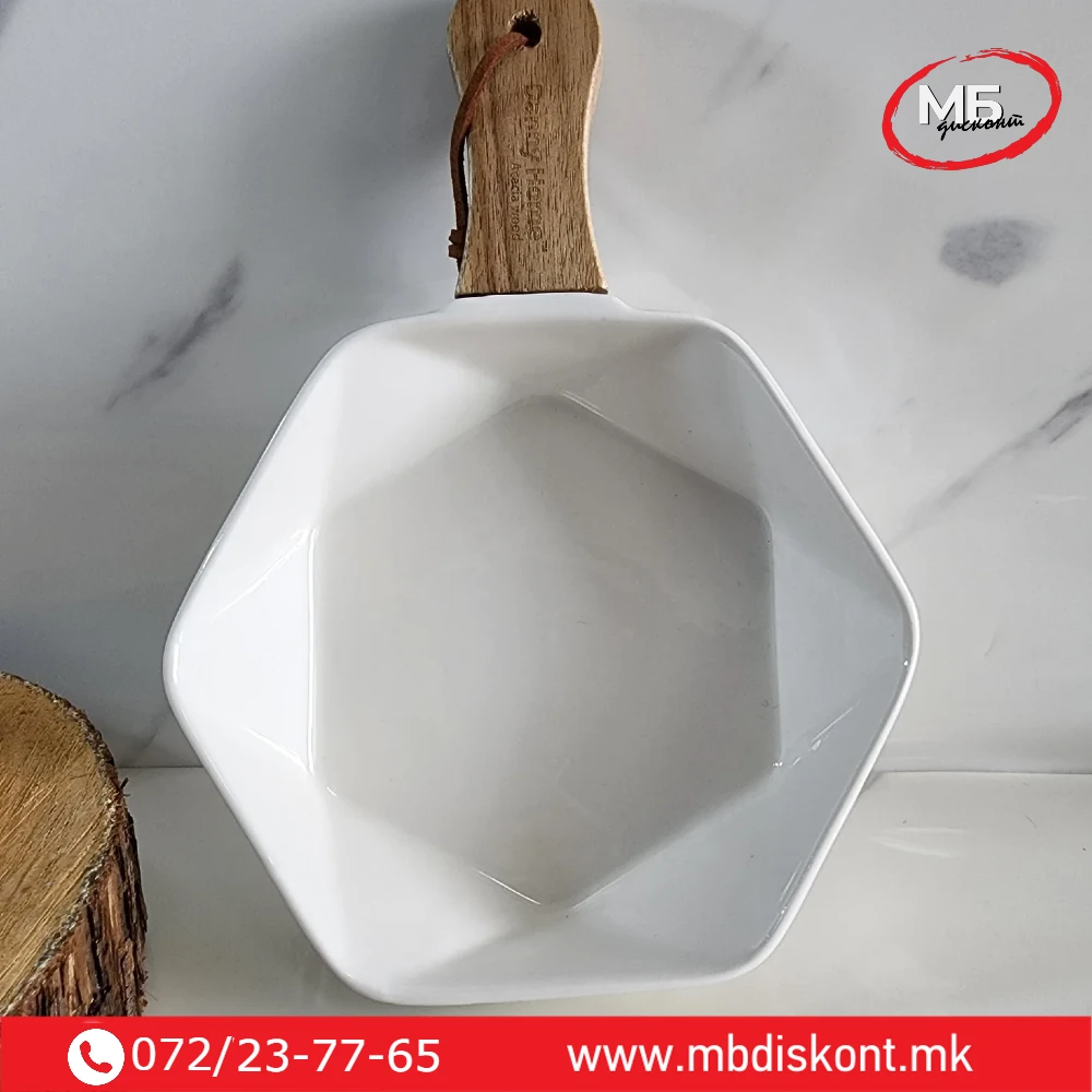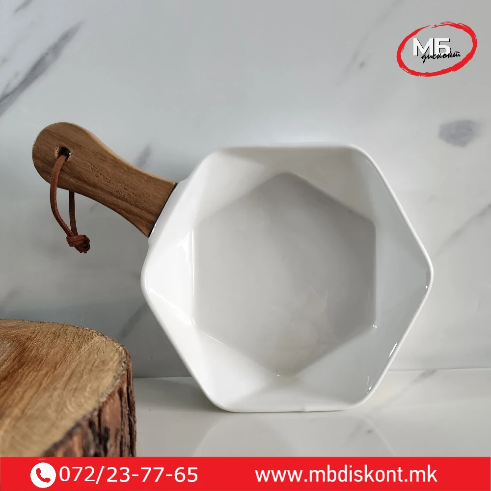 Чинија порцелан длабока со дрвена рачка за сервирање