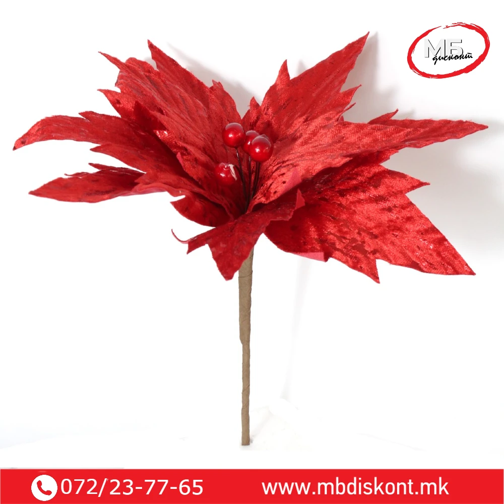 Еуфорбија црвена 25 см е еден од најпознатите празнични декоративни цветови кој внесува топлина и свеченост во секој дом. Со својата длабока црвена боја и реалистичен изглед, оваа еуфорбија претставува совршен избор за украсување новогодишна елка, празничен венец или свечена маса.