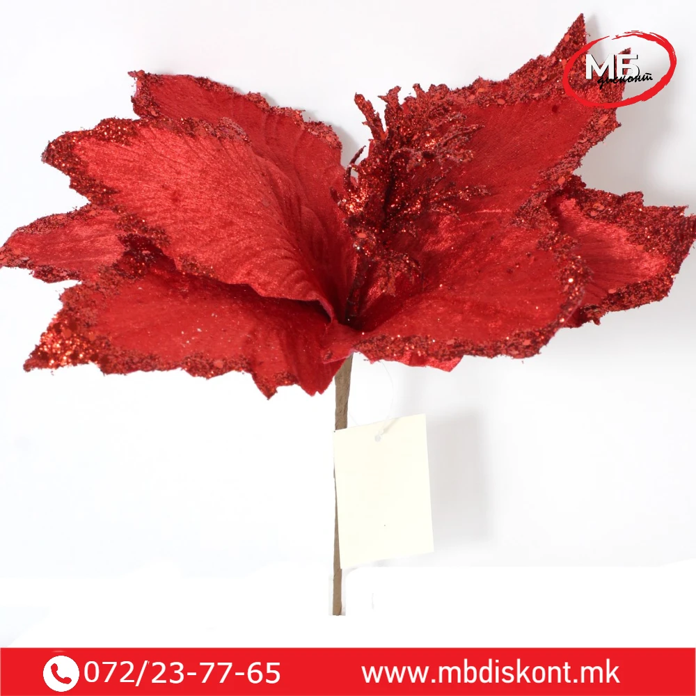 Еуфорбија црвена е еден од највпечатливите украсни цветови што ја симболизира празничната радост и топлината на домот. Со својата интензивна црвена боја, таа претставува совршен избор за украсување на новогодишна елка, свечена трпеза или празничен венец. Со дијаметар од 30 см, овој цвет додава волумен и хармонија во секој декор.