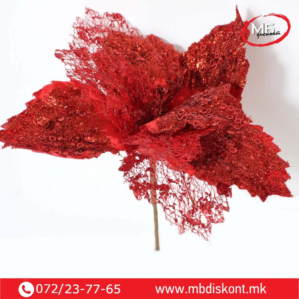 Еуфорбија црвена проѕирна е изработена од лесен и издржлив синтетички текстил кој не се гужва и не ја губи бојата. Благодарение на флексибилниот држач, цветот може лесно да се прицврсти на елка или аранжман. Материјалот е транспарентен со суптилен сјај, што создава впечаток на природна свежина и динамика.