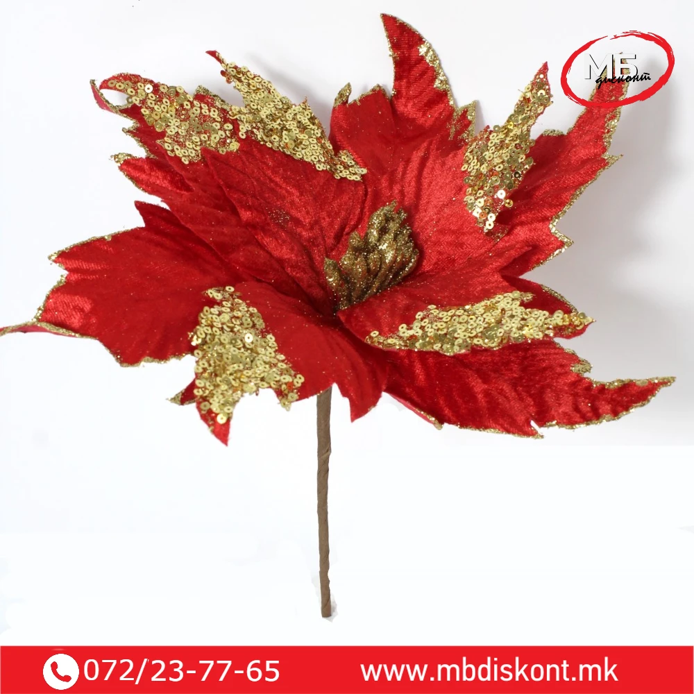 Еуфорбија црвена злато е совршен декоративен цвет кој ќе ја збогати секоја новогодишна или зимска декорација. Со својата комбинација од интензивно црвена боја и златен раб, овој украс внесува чувство на свеченост, топлина и класичен празничен шарм. Со дијаметар од 30 см, цветот е доволно голем за да биде акцент во декорот, но и доволно лесен за лесно поставување.