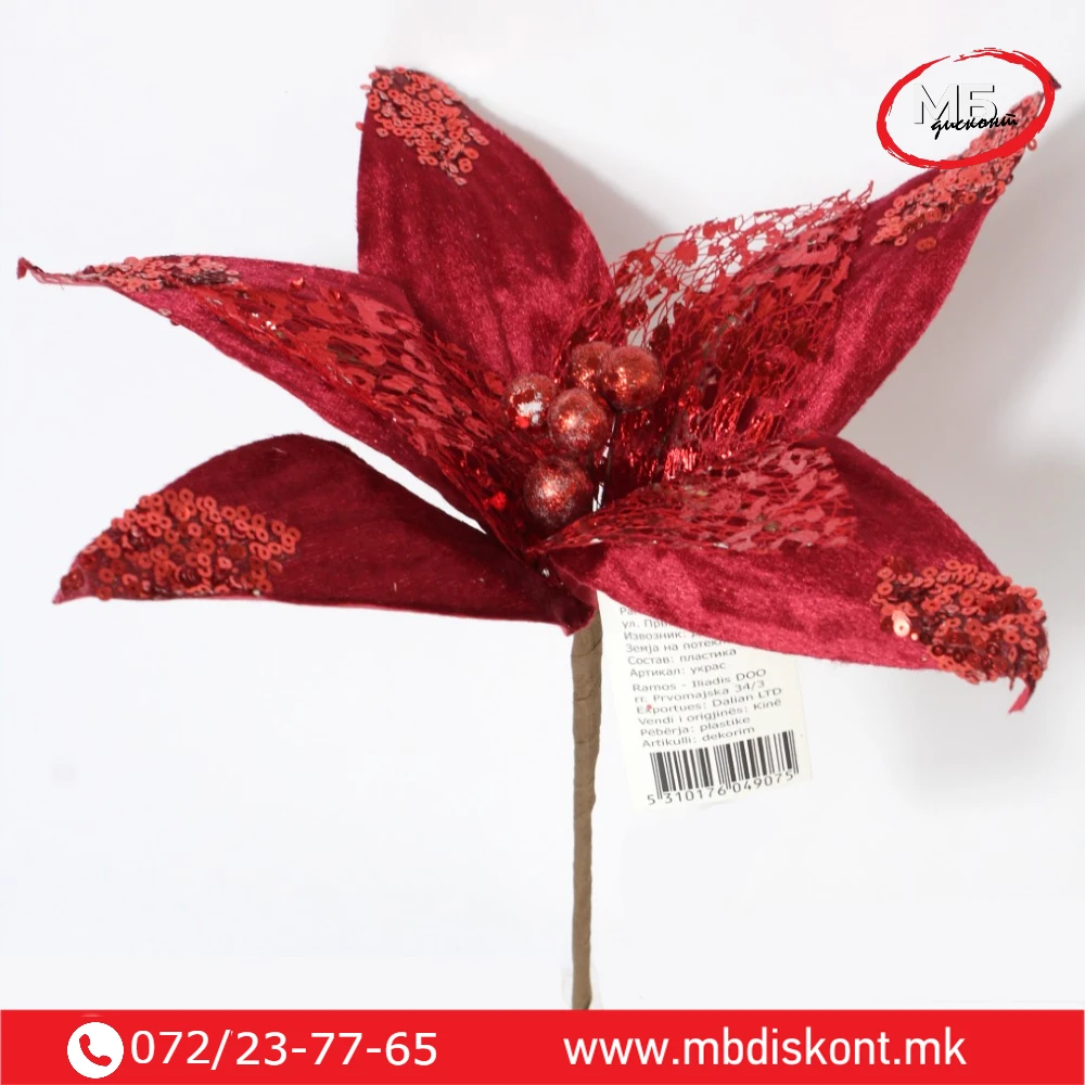 Еуфорбија плиш вино е цветен украс кој комбинира богатство, луксуз и топлина во едно. Со својата длабока винска нијанса и плишана текстура, овој декоративен цвет претставува совршен избор за празнични украси, новогодишни елки и свечени аранжмани. Дијаметарот од 25 см го прави доволно впечатлив за да биде централна точка во секој декор.
