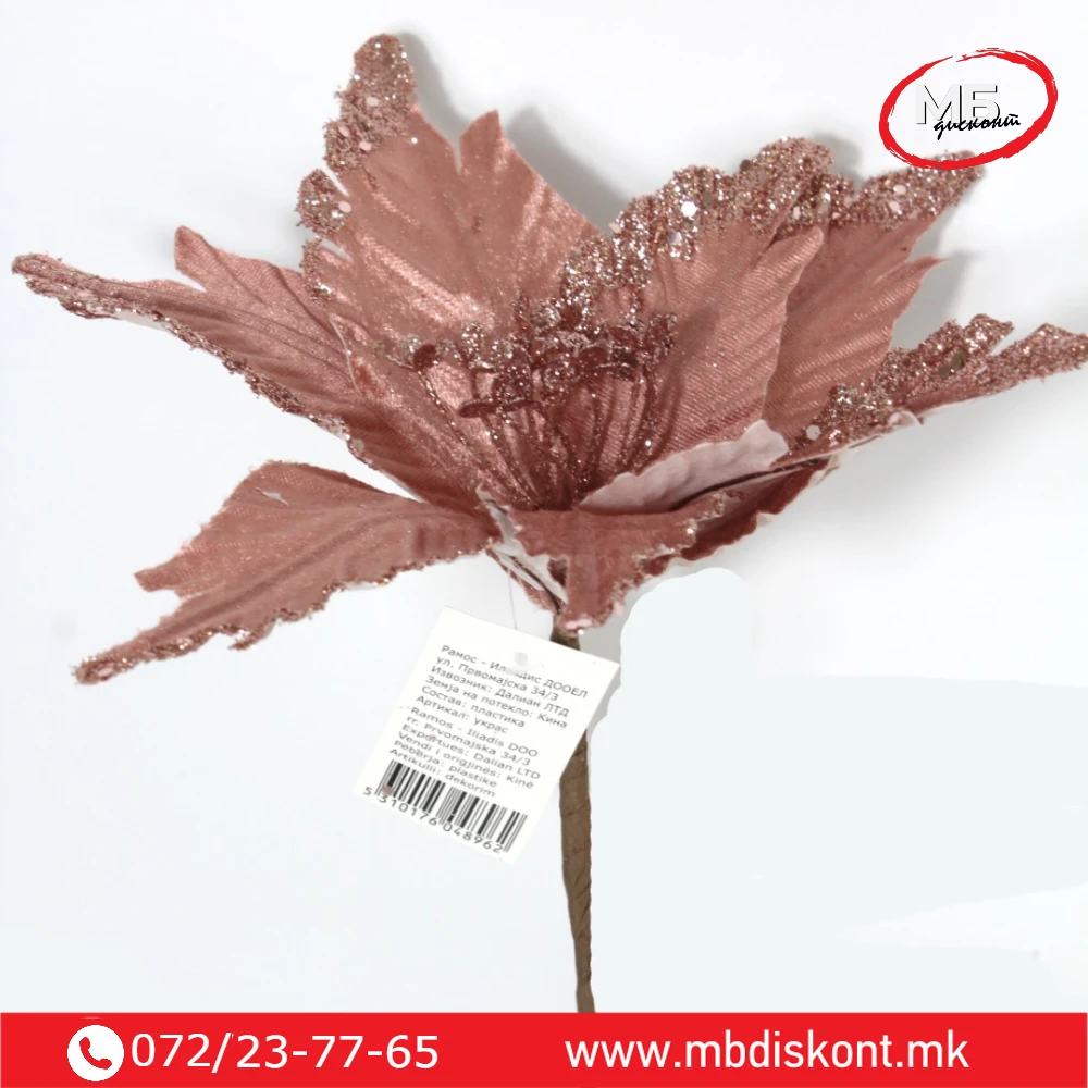 Еуфорбија розе е еден од најелегантните декоративни цветови што можат да ја разубават вашата новогодишна елка. Со својот мек розов сјај и блескав дизајн, овој украс внесува топлина, гламур и празнична магија во секој дом. Благодарение на внимателната изработка и квалитетните материјали, цветот изгледа како вистински, а неговата фина текстура додава чувство на луксуз и префинетост.