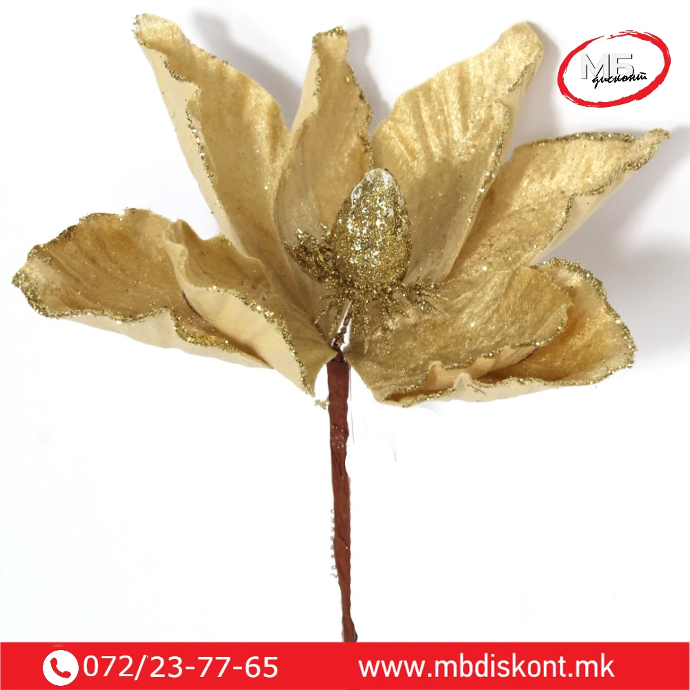 Магнолија крем злато е еден од најелегантните декоративни цветови кои ќе внесат раскош, топлина и префинетост во секој празничен простор. Комбинацијата на крем и златна боја создава чувство на луксуз, правејќи ја оваа магнолија совршен избор за новогодишна елка, свечена маса или празничен аранжман.