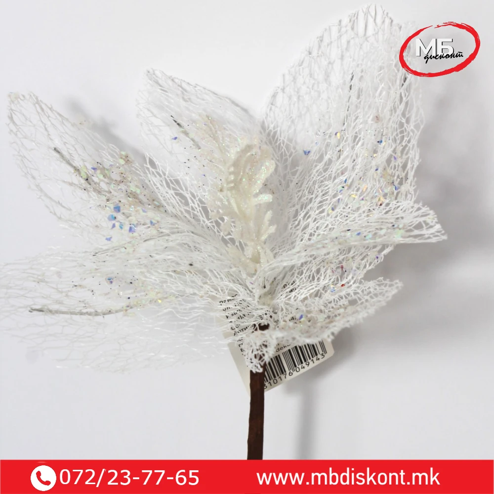 Цвет пајажина бел е декоративен украс кој внесува мир, стил и празнична свежина во секој простор. Неговата бела боја и нежната структура што потсетува на пајажина создаваат уникатен и модерен изглед. Совршен е за празнична, зимска или свадбена декорација, како и за елегантни домашни аранжмани.