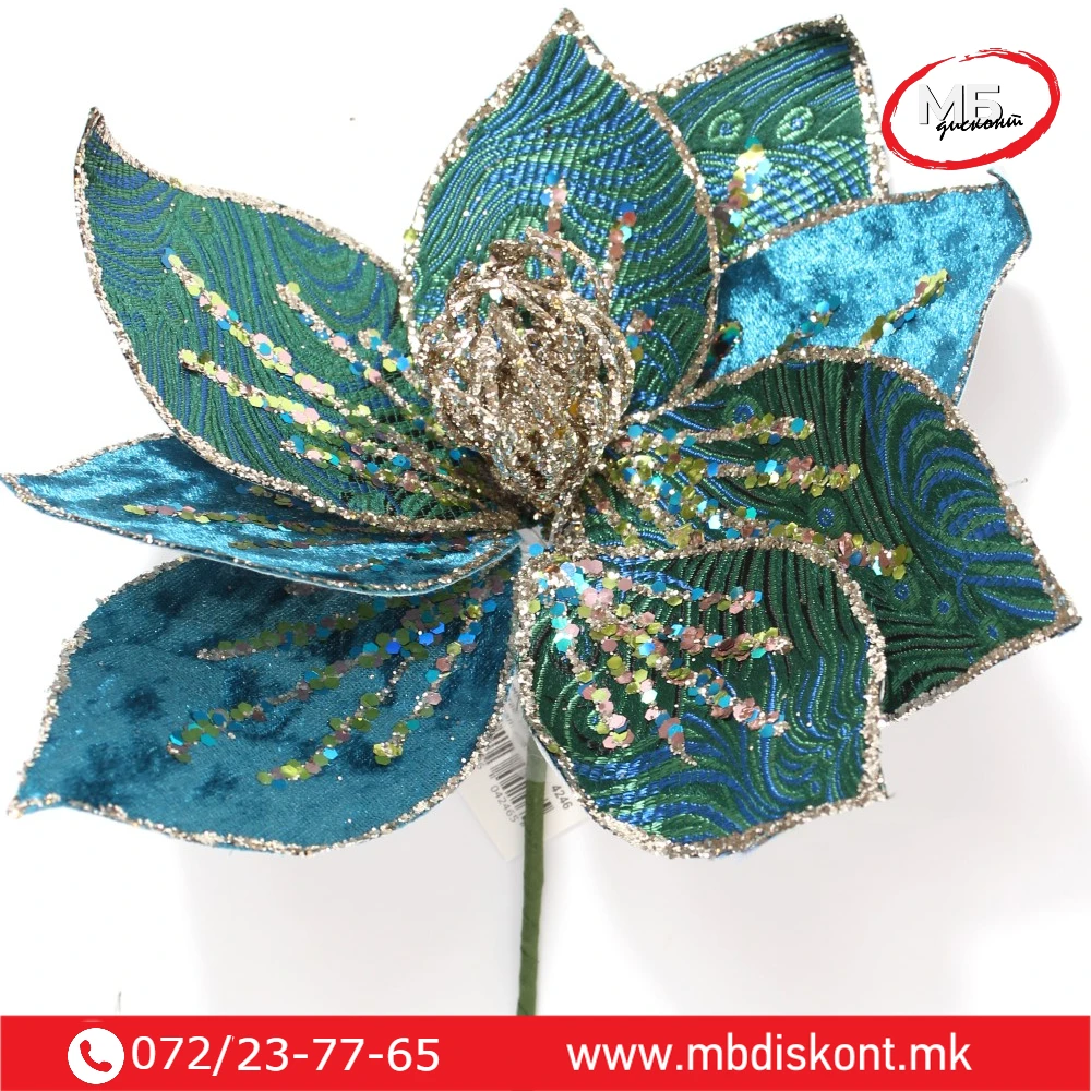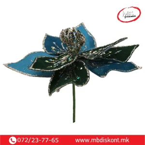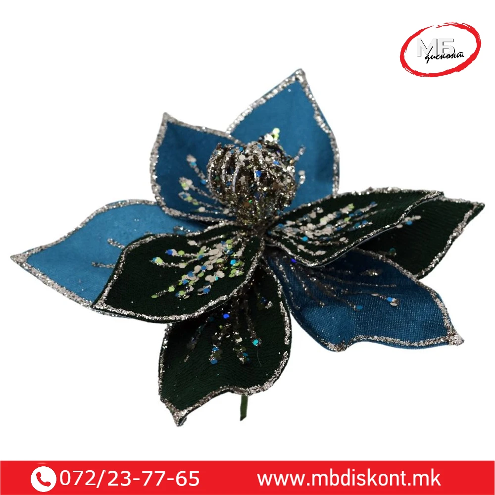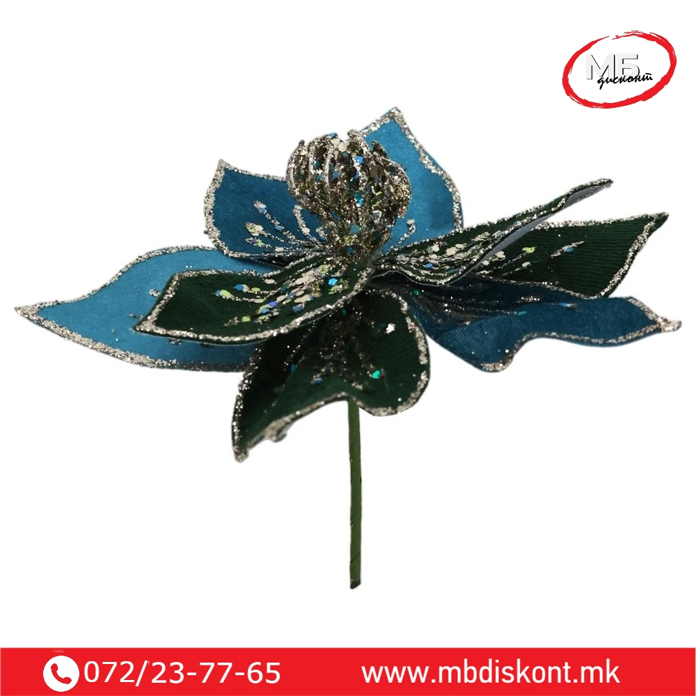 ✨ Цветовите се достапни во богата тиркизна боја, која е идеална за комбинирање со златни, сребрени и бели украси. Материјалот од полиестер нуди реалистичен изглед и трајност. Цветот може да се користи на елка, венци, завеси, на маса, полици или дури и во аранжмани за подарок.