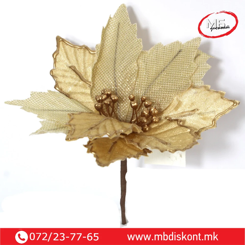 Еуфорбија злато ивица е совршен украс за сите кои сакаат да создадат празнична атмосфера со доза на елеганција и раскош. Овој декоративен цвет комбинира класичен бел дизајн со златен раб, што му дава свечен и модерен изглед. Со дијаметар од 25 см, идеален е за украсување новогодишна елка, венци, вазни или свечени маси.