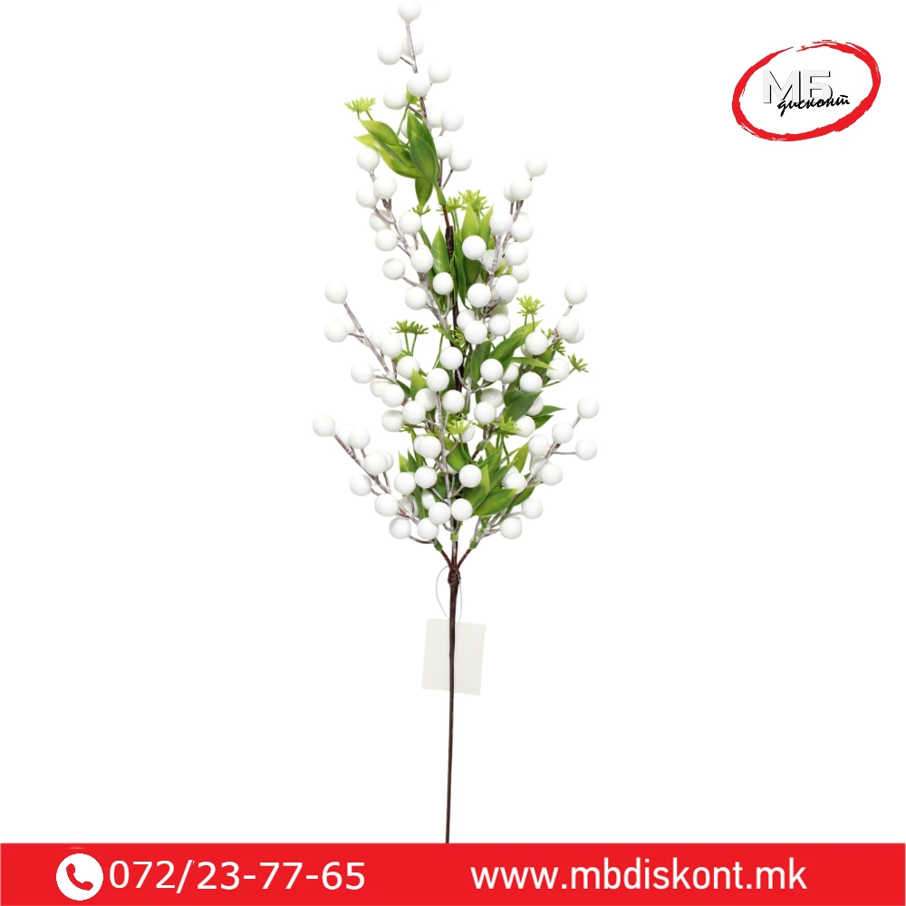 Бобинките со мат бела текстура создаваат впечаток на нежно замрзнати капки, додека долгата и флексибилна гранка овозможува лесно уредување во различни празнични аранжмани.