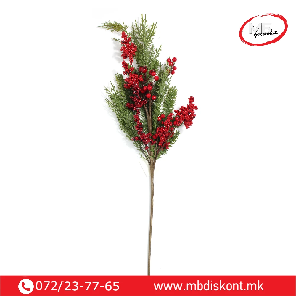 аранжмани. Со природен зелен тон, богати иглички и декоративни бобинки, оваа гранка внесува автентична зимска атмосфера во секој дом или деловен простор.