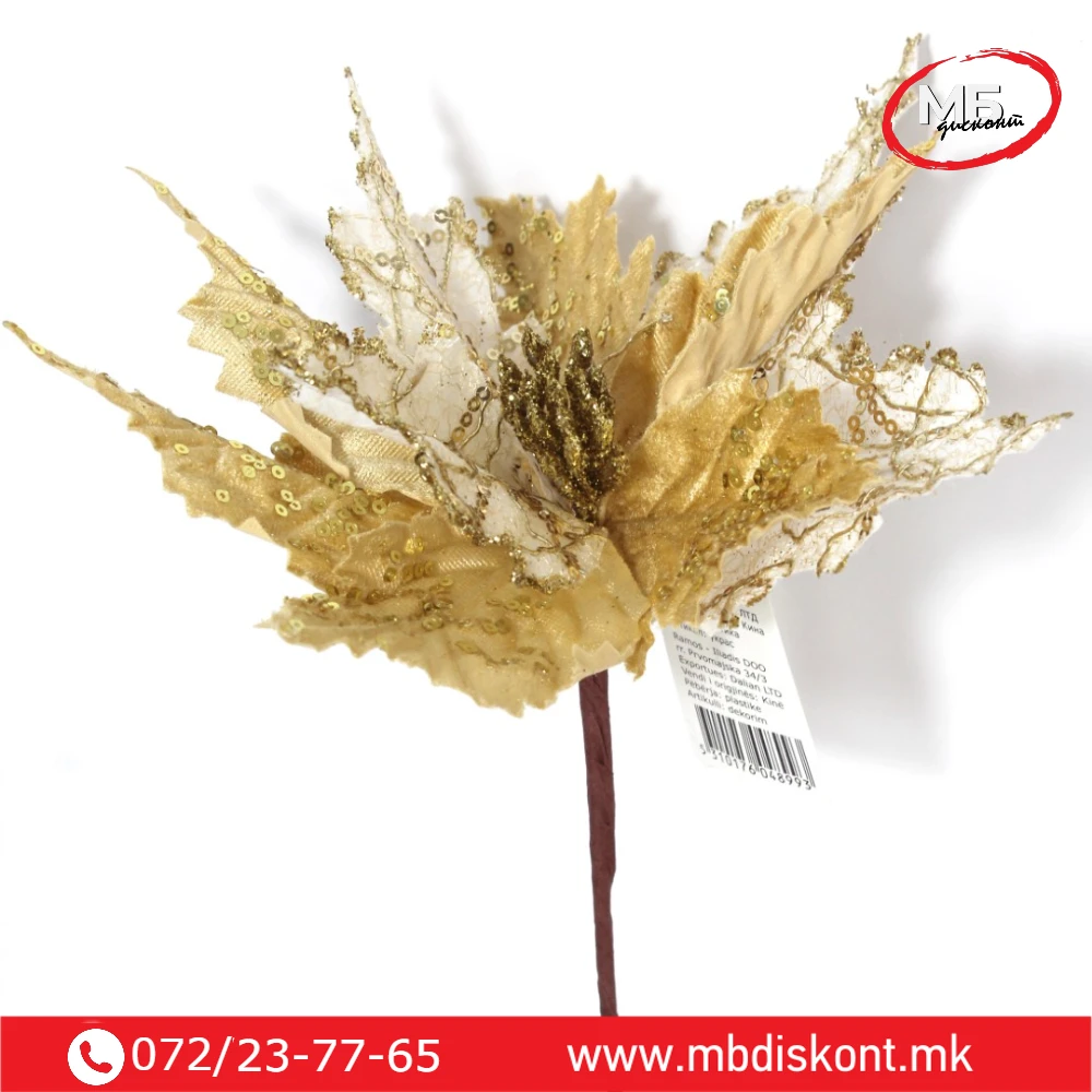 Еуфорбија злато бела е совршен декоративен додаток што ја претвора секоја новогодишна елка во уметничко дело. Со прекрасна комбинација на златна и бела нијанса, овој цвет внесува свеченост, топлина и стил во вашиот дом. Идеален е за украсување елки, венци, аранжмани или празнични маси.