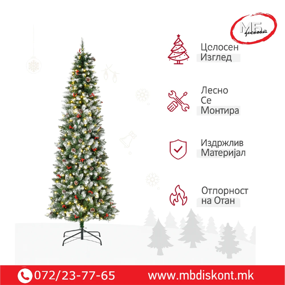 Доколку сакате оваа празнична сезона да донесе вистинска зимска магија во вашиот дом, Снежна Слим Елка со Бобинки е совршениот избор. Со својот елегантен, тенок дизајн и реалистичен снежен ефект, оваа елка внесува топлина, стил и празничен дух во секој простор. Без разлика дали ја поставувате во дневна соба, канцеларија или продавница, нејзиниот изглед секогаш остава импресивен впечаток.