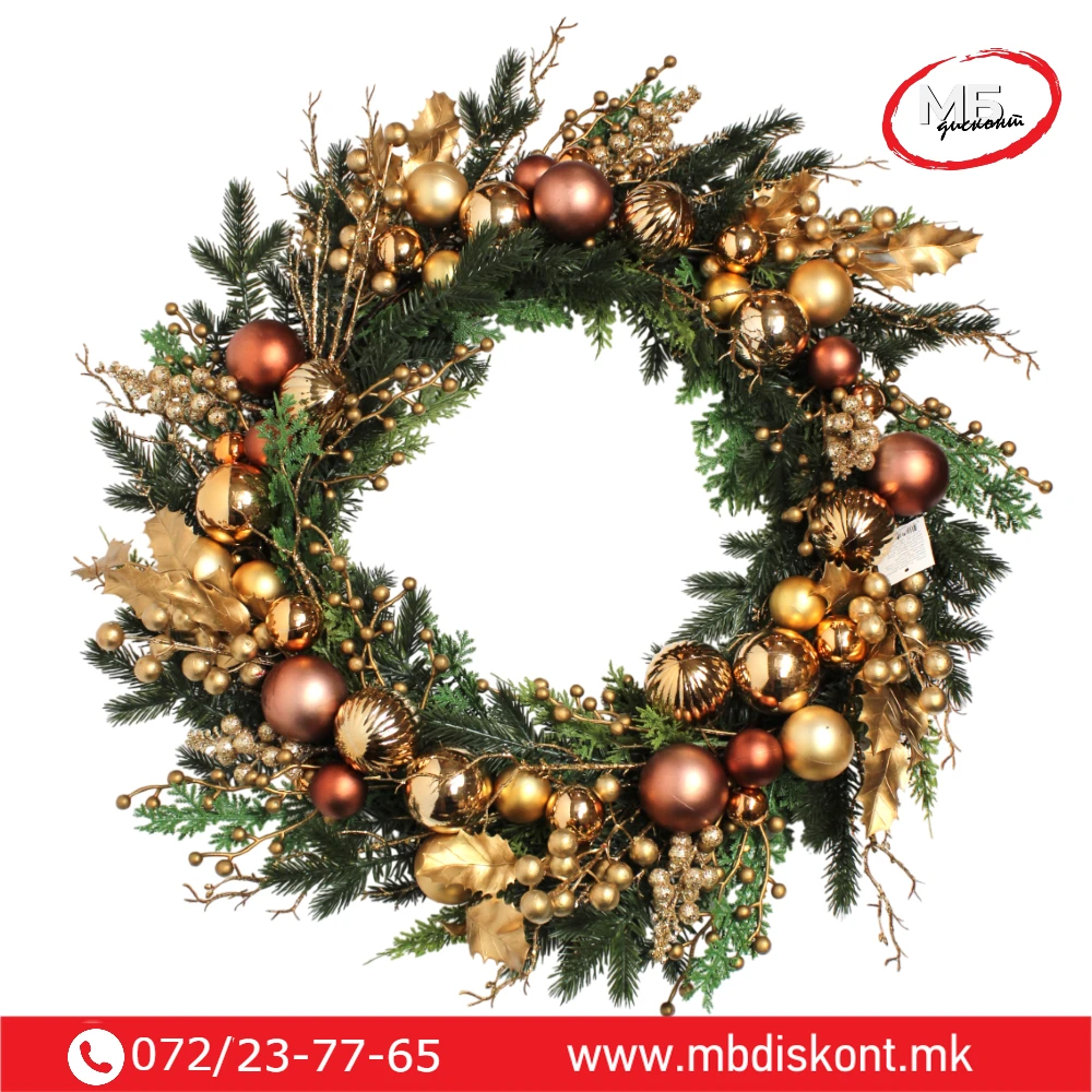 Со својата голема димензија и декоративни лампиони, овој венец создава топла